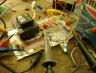Then sometimes veroboard But small terminal blocks with leaf contacts below the screws work. I also use a plastic sheet with holes poked and point to to point wiring. Push-Pull Class B using 2 x 1j24b and an iv15 indicator as phase inverter. The second iv15 is just an indicator, they serve as scale lamps, filaments in series off the 1.3V NiMH The transformer is a 110-0, 110-0 to 6V or 9V 3W type. Two Vero style tag strips stuck to coffee tin, which is also earth, wide enough apart for anode end to the base. Then the next tube mounted in the opposite direction. I did also cutout vero mounted in small Eddystone box, to gain space: |